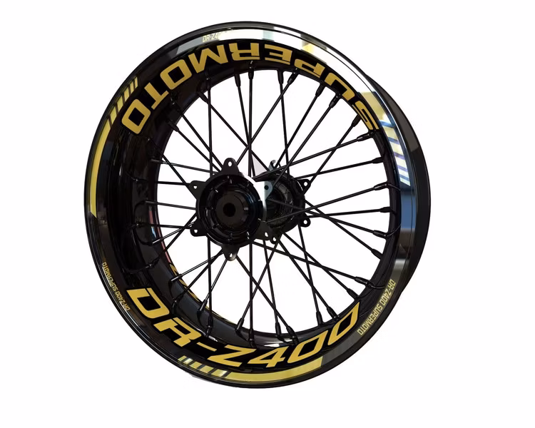 Set de adhesivos para ruedas Suzuki DR-Z 400. 100 % completo incluyendo rueda delantera y trasera, ambos lados de cada rueda.
