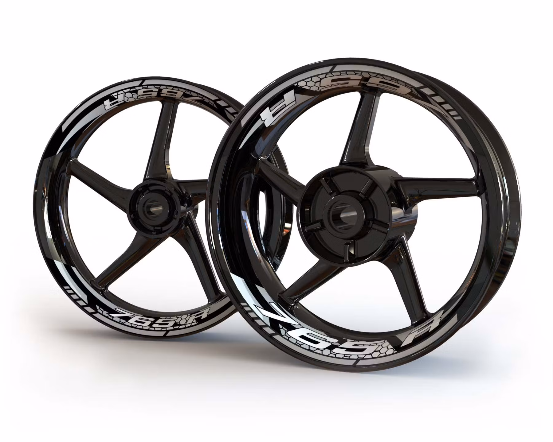 Autocollants pour jantes Triumph Street Triple R 765 17". 100% complet comprenant les roues avant et arrière, les deux côtés de chaque roue.