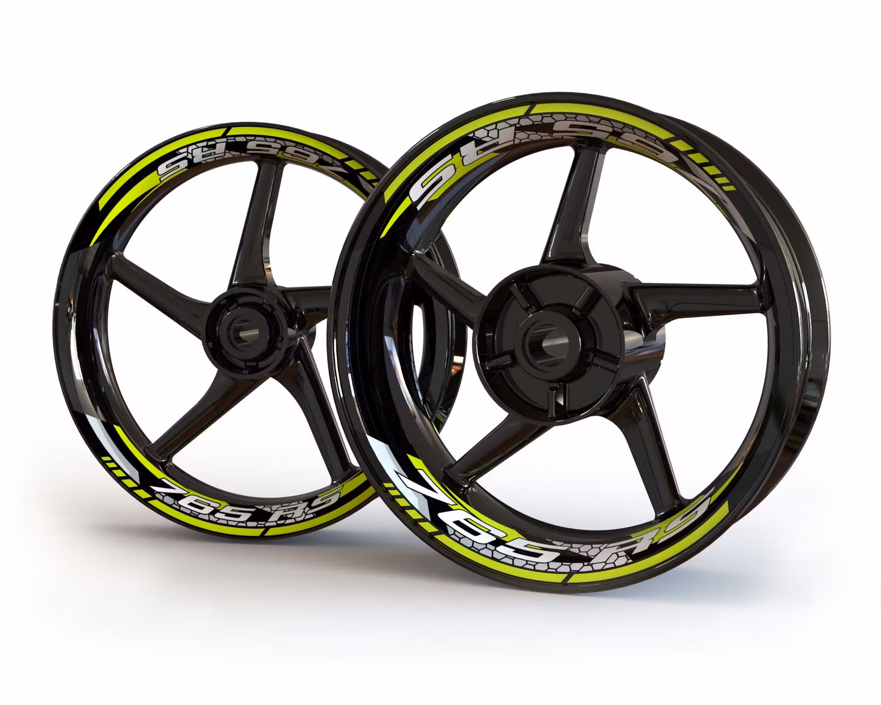 Autocollants pour jantes Triumph Street Triple RS 17". 100% complet comprenant les roues avant et arrière, les deux côtés de chaque roue.