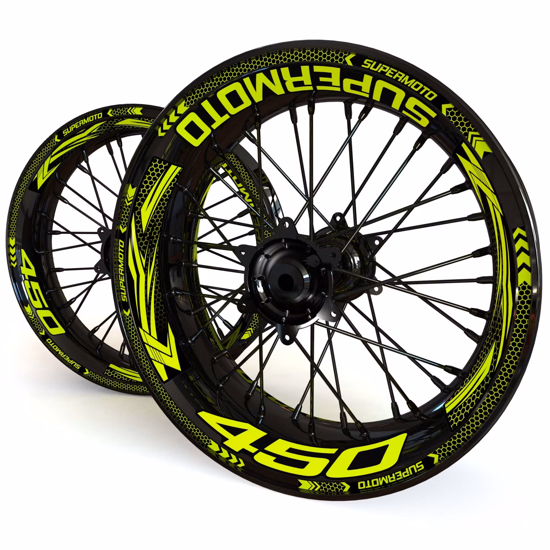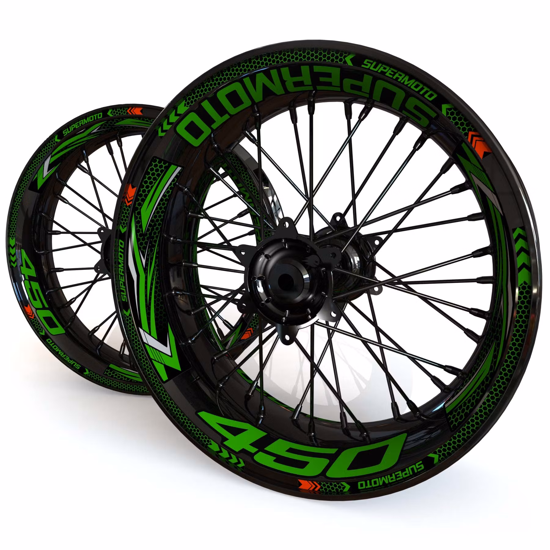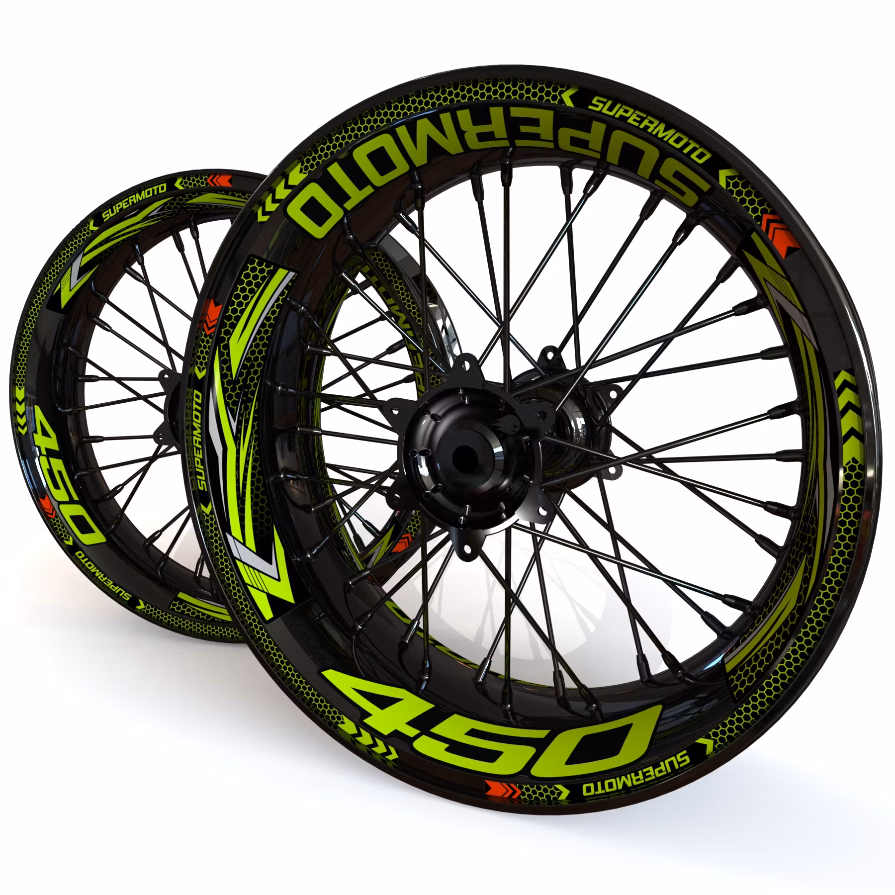 The amazing design elements of the plus design will make your motorcycle stand out like never before. The rim stickers suitable for Kawasaki KXF450 are printed on high-end vinyl and protected with a strong laminate for extra durability and longevity. With a strong but slow-acting glue, you can adjust the stickers several times before it sticks and reaches full adhesion. Fits Kawasaki KXF450.