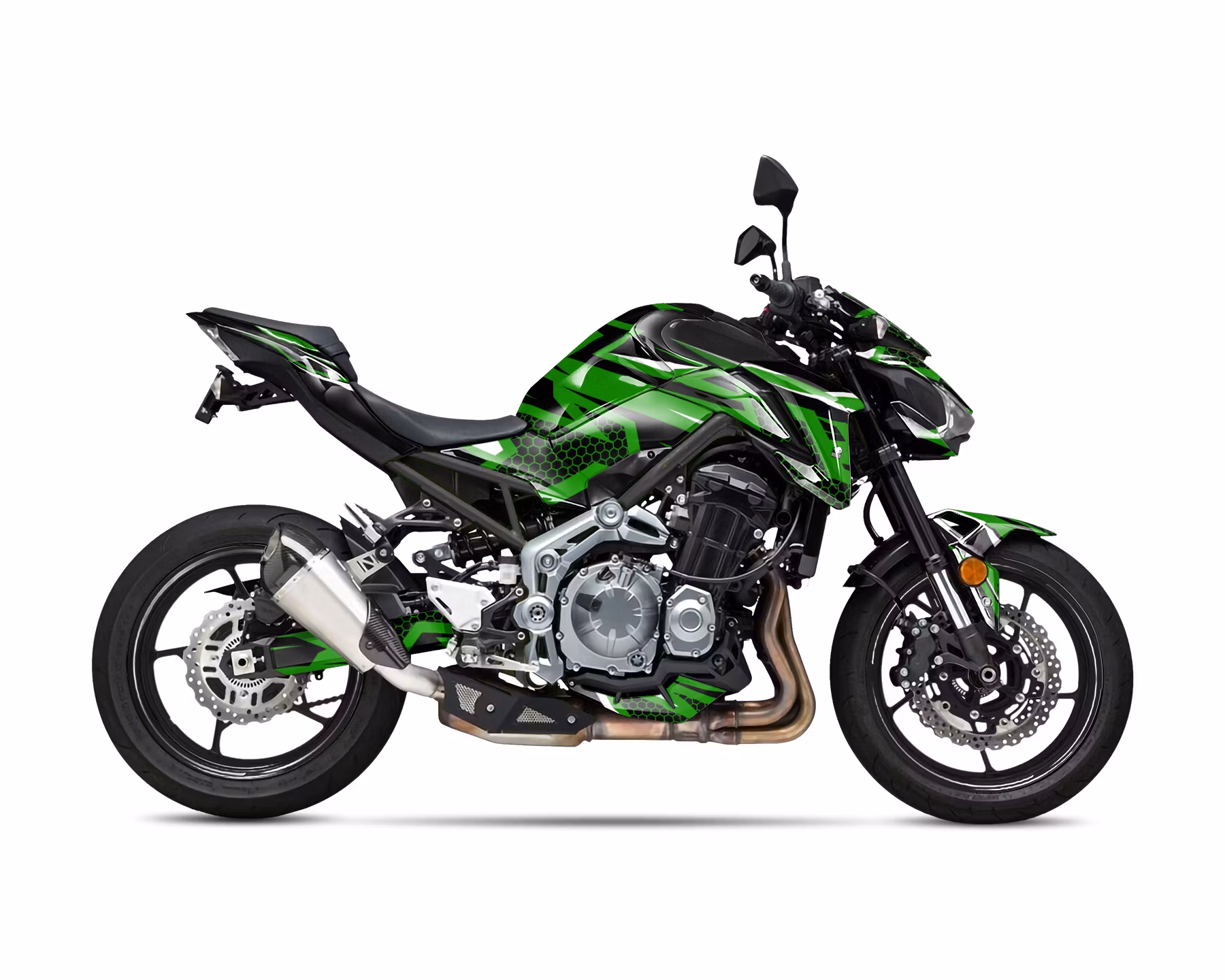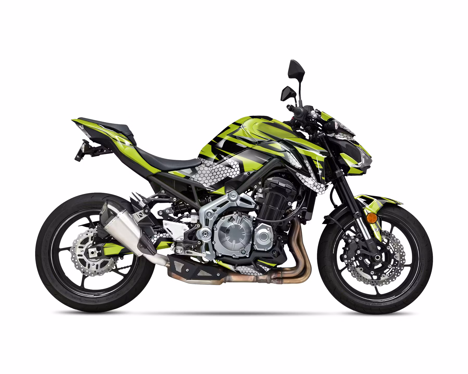 Completely transform your Kawasaki Z900 motorcycle with our spectacular, unique and eye-catching sticker kit. The bike stickers are made of premium grade vinyl and due to the extra protective laminate layer the stickers have a fantastic durability and longevity. The adhesive is slow-acting so you can fix and re-adjust the stickers if you made an installation mistake. Full adhesion is reached after 24 hours.
