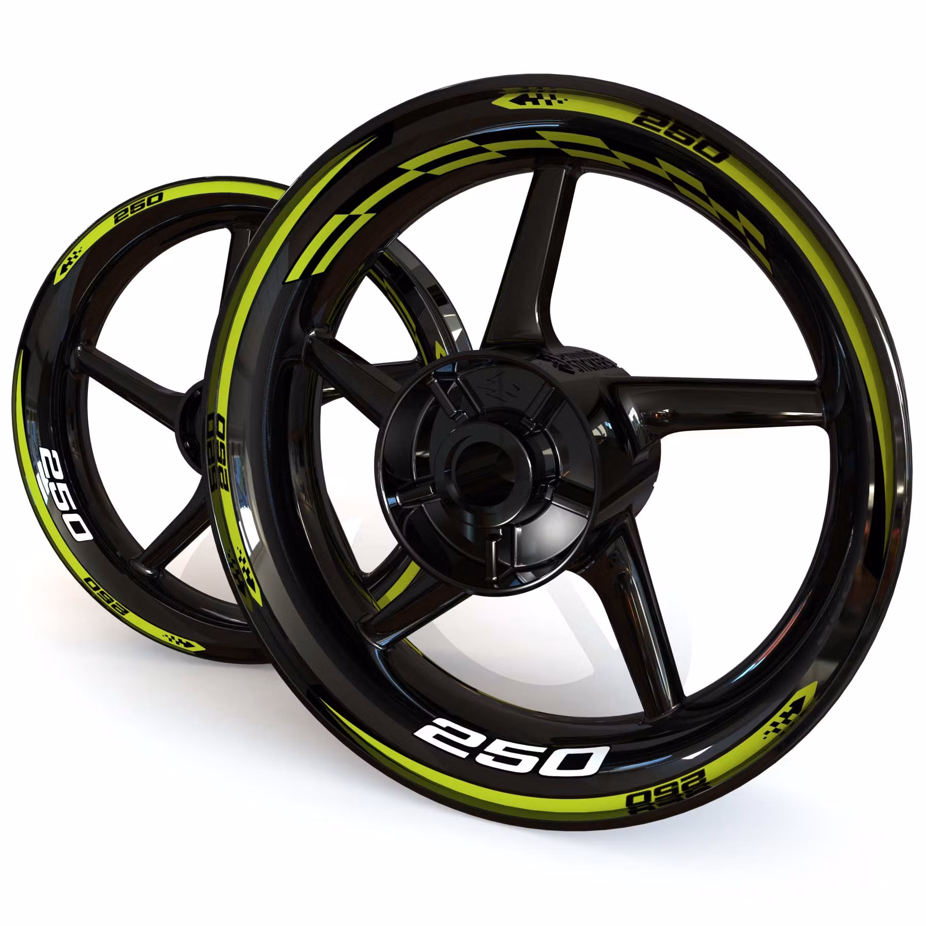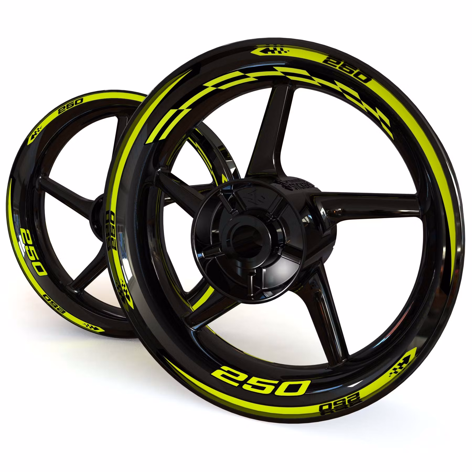 Med en unik design, livfulla färger och premiummaterial kommer dessa fälgdekaler att vara ett perfekt komplement till din Kawasaki Z250. Dekalerna är laminerade med ett gediget skyddslaminat för extra hållbarhet och livslängd. Med ett starkt men långsamt verkande lim kan du justera klistermärkena flera gånger innan det fastnar och når full vidhäftning. Passar Kawasaki Z250.