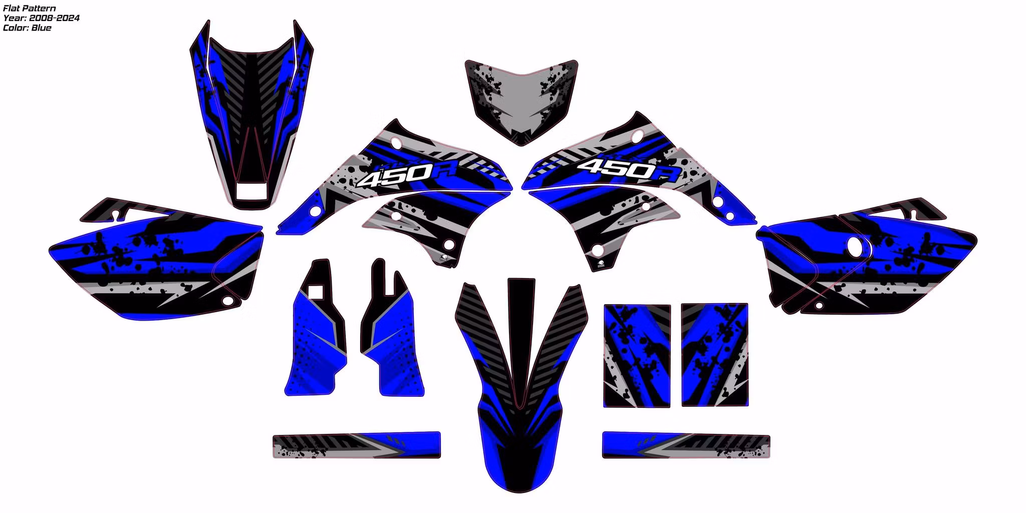 Designen presenteras på två olika motorcyklar. En med större kåpor och en med mindre kåpor så att du får en bättre uppfattning om hur designen kan se ut på din motorcykel. Vissa mönster, som endast visas i en färg på grund av deras komplexa färgscheman, kan inte anpassas och är endast tillgängliga i standardfärger.