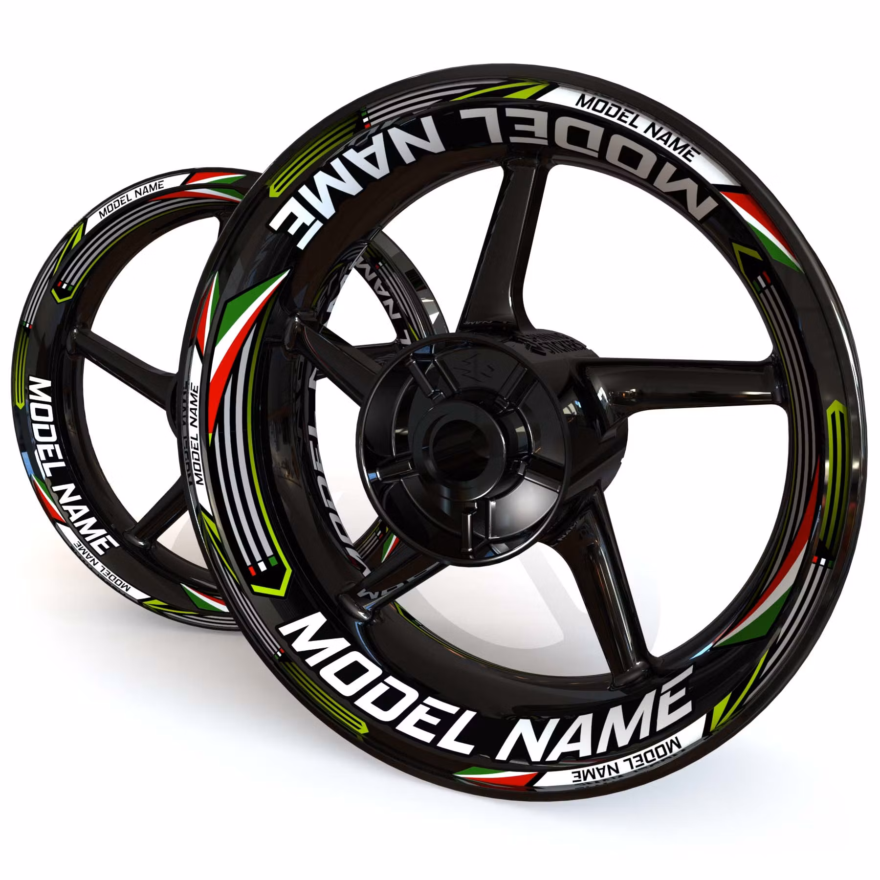 Your Text 17" Wheel stickers set. 100% Complete including front & rear wheel, both sides of each wheel.